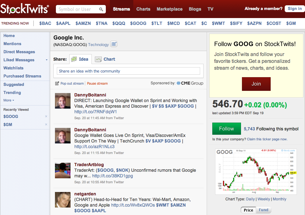 StockTwits, invece, attraverso un approccio basato sulla community, offre un servizio di informazione per gli investimenti. Gli utenti possono “ascoltare” gli investitori e i commercianti, o contribuire alla conversazione. Il servizio sfrutta Twitter come piattaforma di produzione di contenuti e trasforma i tweet in dati di tipo finanziario, strutturati per titoli, utenti, e reputazione.