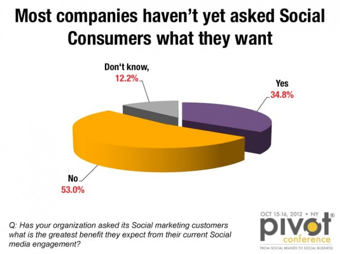Una indagine condotta da Pivot ci dice che esiste un forte divario comunicativo tra aziende e clienti sui social. Emerge dai dati che ciò che un’azienda percepisce che il cliente possa volere dalla sua presenza sociale, contrasta con il reale interesse che il consumatore ha. Nel dettaglio, emerge che le aziende ancora non si preoccupano di domandare agli utenti cosa vorrebbero e che quindi prevale ancora l’autorità aziendale sull’ascolto infatti, ben il 52% degli intervistati tra coloro che si occupano di Social Media Marketing, non si è preoccupato di chiedere agli “ascoltatori sociali” quali benefici vorrebbero trarre da una eventuale iscrizione ai canali social