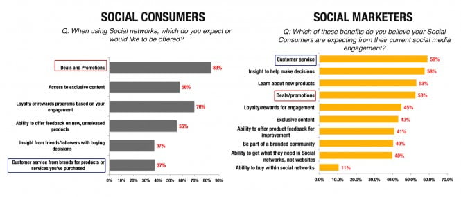 Poi, la cosa ben più grave è che, se osserviamo il grafico qui sotto, è evidente che le aziende non hanno ben ascoltato i loro già follower sui social! Analizzando i dati notiamo come, mentre i clienti dalle aziende sui social richiedono incentivi come coupon, incentivi all’acquisto (ben 83%), contenuti speciali (70%) e premi per gli utenti più partecipativi (80%) le aziende pensano che il massimo beneficio che un follower può trarre da un servizio di Social Media Marketing è il customer service (per il 59%) seguito da supporto per prendere decisioni d’acquisto (58%).