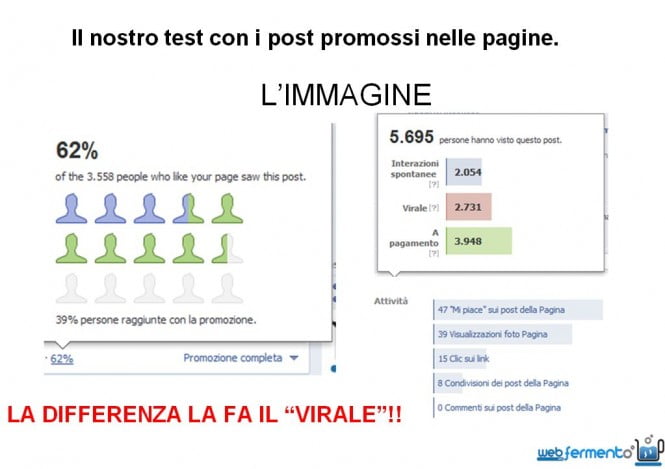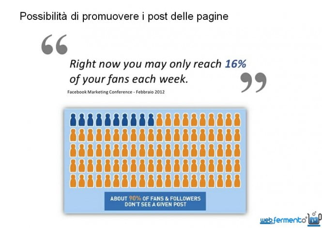Sostanzialmente Facebook dice che in media, a livello mondiale, circa il 16% degli utenti iscritti alla pagina vede i contenuti pubblicati. Questo non vuol dire che tutte le pagine vedono hanno un 16% di visibilità media dei post (ad esempio webinfermento ha una media del 40%) e in genere pagine nuove e con pochi “fans” hanno più visibilità in proporzione a pagine con molti più fans. E’ un fattore statistico piuttosto naturale se pensiamo al fatto che al crescere del numero di utenti si ha più difficoltà nel raggiungerli tutti e per ottenere ciò si dovrebbe fare in modo che tutti cliccassero sui contenuti, mettessero il “mi piace”, commentassero ecc. Cosa alquanto improbabile. Le vie quindi sono 2: impegnarsi nella produzione di contenuti altamente coinvolgenti per spingere quanti più utenti ad un’interazione oppure pagare i post affinché utenti che normalmente non vedono il contenuto, possano così visualizzarlo e magari effettuare un’interazione. Ecco il motivo dell’introduzione dei post promossi.