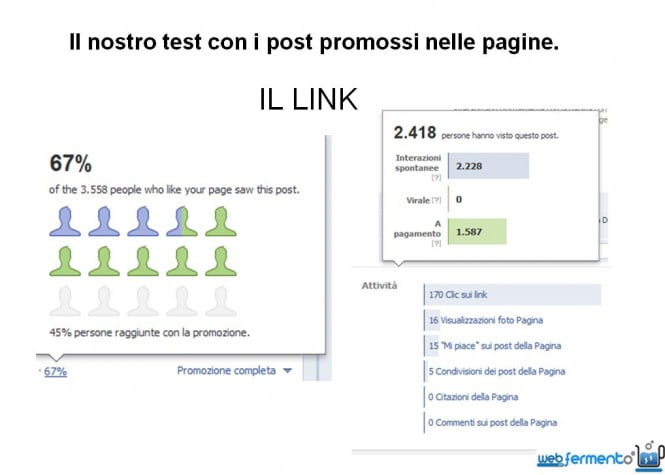 Abbiamo voluto testarli sia per verificare se valgono la pena, sia per comprendere su quale contenuto sarebbe meglio sfruttarli. Abbiamo effettuato il test su un link esterno non testuale che rimandava a un post del nostro blog e avviato un altro post promosso su un’immagine, di per se già divertente, con del testo associato. Per quanto riguarda il test sul link, le statistiche, che sono in tempo reale, hanno mostrato che nel totale il post ha raggiunto il 67% di 3.558 fans della pagina di webinfermento, di questi il 45% è stato raggiunto con la promozione. In particolare il link ha avuto 170 click, 15 mi piace e 5 condivisioni del post. Il post del blog in questione ha avuto un picco di accessi che ne hanno permesso di diventare uno dei post più virali del nostro blog.