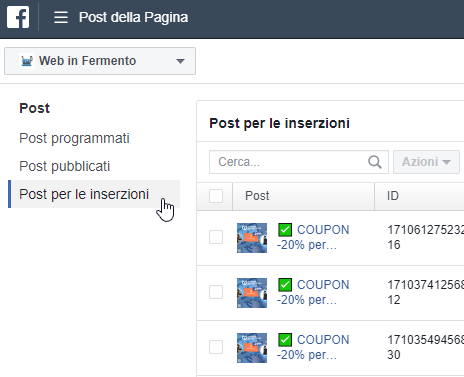 Tramite questa voce è possibile per l’utente visualizzare tutti i Post che in quel preciso momento la pagina sta sponsorizzando, a prescindere che siano pubblicati o meno in bacheca.