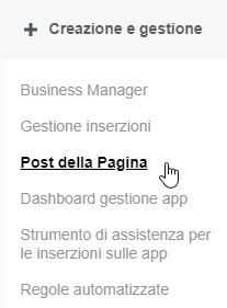 Una volta entrati nel Business Manager o in Gestione Inserzioni, aprendo il Menu grande troviamo la voce Post della pagina.