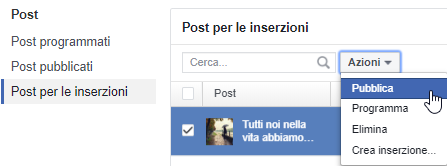 A questo punto selezioniamo il post che intendiamo pubblicare sulla pagina e clicchiamo su Azioni aprendo la relativa tendina.