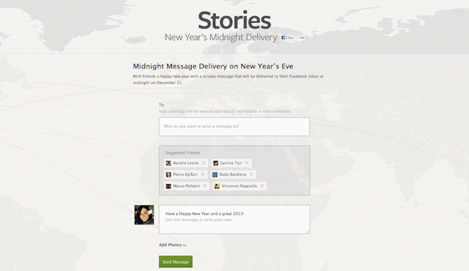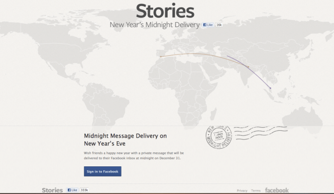 C’è qualcuno dall’idea degli auguri ha pensato di creare un’evoluzione del proprio strumento per farlo diventare ancora più preciso con un solo obiettivo: si vuole che gli auguri partano e arrivino a destinazione alle ore 00.00.00! Questo qualcuno si chiama Facebook che, nel progetto Facebook Stories che abbiamo imparato a conoscere nelle settimane precedenti con “il 2012 in breve”, ha introdotto qualche giorno fa New Year’s Midnight Delivery un nuovo modo per sfruttare il canale, attraverso l’invio di messaggi privati programmati ai propri contatti per la notte di capodanno.