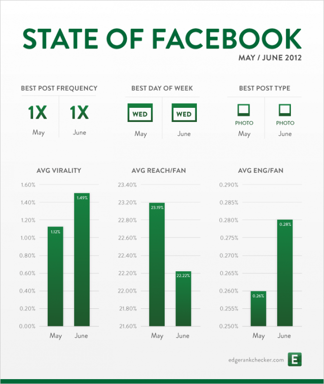 Per quanto riguadra la produzione dei contenuti l’attenzione deve, per forza di cose, essere rivolta allo studio di modi e tempi attraverso il quale comunicare attraverso Facebook. EdgeRank Checker periodicamente mette a disposizione dei dati che analizzano come le marche si comportano nei confronti del pubblico e quali sono le risposte complessive che si ottengono. Il periodo di analisi dell’ultima indagine rilasciata riguarda il bimestre maggio-giungo 2012 ed ha interessato 1000 pagine con un bacino di utenti di grandi e medie dimensioni di settori variegati tra loro.