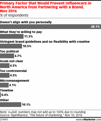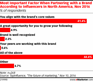Emarketer ci riporta una ricerca che ha coinvolto proprio la figura della “star del web” per indagare, con un livello di dettaglio maggiore, le motivazioni che li spingono a collaborare con determinate aziende mettendo a disposizione la propria audience. Le caratteristiche dei 268 top influencer americani intervistati è quella di avere una reach di almeno 259,000 utenti.