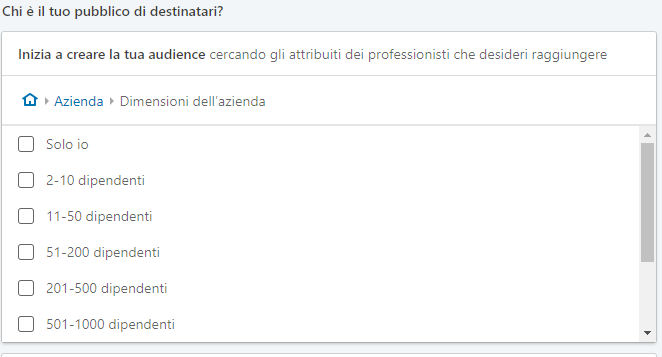 - Dimensioni dell’azienda (raggiungi gli utenti in base alle dimensioni dell’azienda in cui lavorano)