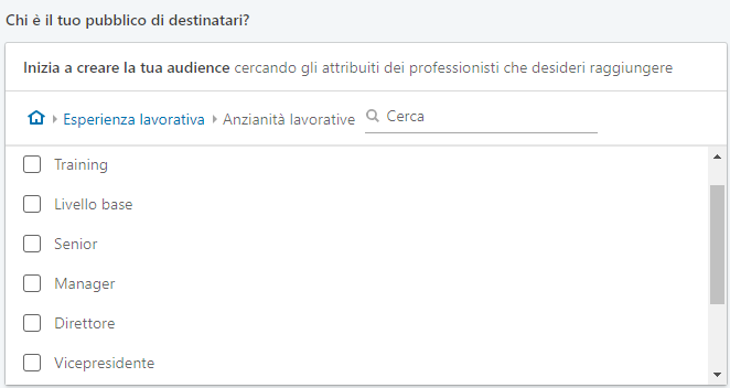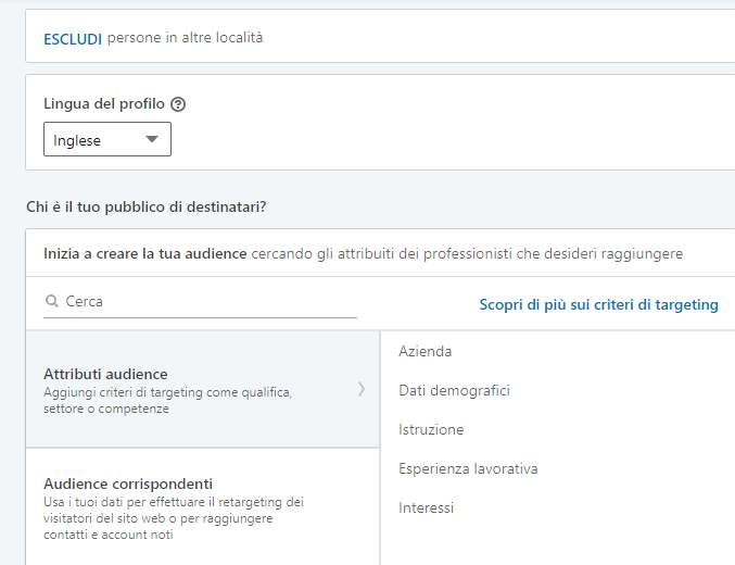 - Competenze dell’utente (raggiungi gli utenti in base alle competenze indicate nel loro profilo professionale)