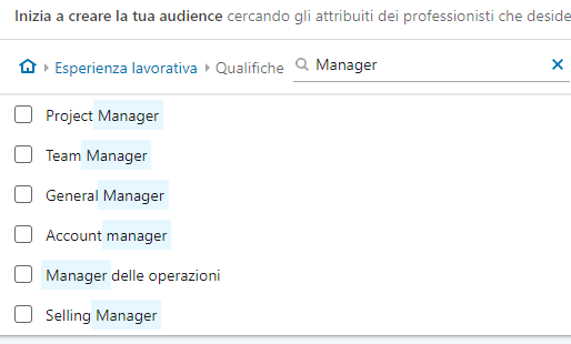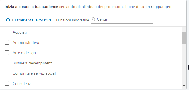 - Settori azienda (raggiungi i professionisti che lavorano in un certo settore)