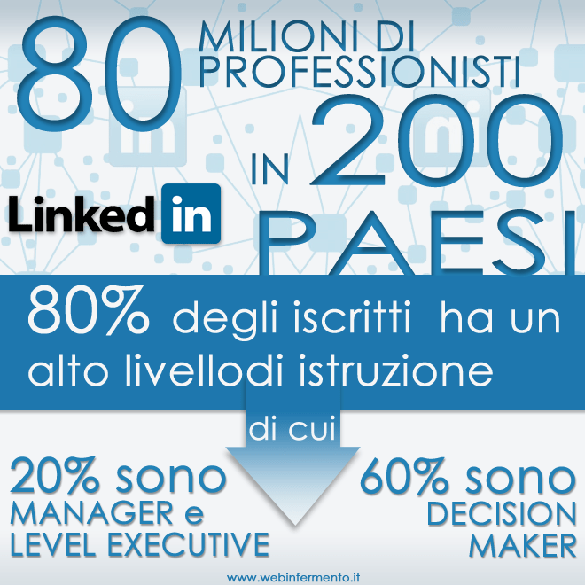 Linkedin è il social network che canalizza la fetta più grande e più influente dei esperti di settore con un bacino di utenza di circa 80 milioni di professionisti, in più di 200 paesi. Fattore ancor più rilevante è che questa presenza è altamente “formata”: più dell’80% degli iscritti è rappresentato da gente con alti livelli di istruzione e riconoscimenti. Di questi, circa il 20% sono Manager o Senior Level Executives, e circa il 60% sono dei Decision Maker presso le proprie aziende e di conseguenza delle molto influenti sulle decisioni correlate all’acquisto o alla scelta di un prodotto in azienda.