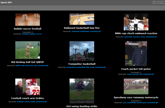 Sito piuttosto old style, ma è relativamente semplice trovare e scaricare gif e meme da specifiche categorie. Comodo il pulsante “random gif” che ne mostra una a caso.