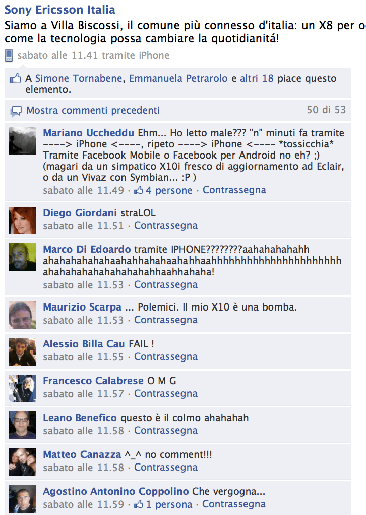 Be questo lo conoscete un po’ tutti anche perché molto recente. 😀 L’”intelligentone” e forse anche “millantatore” di turno (citando un mio collega :-D), decide di postare, seguendo le ultime tendenza dell’essere social da dispositivi mobile, da un iPhone, se non fosse che l’account che gestiva era quello della Sony Ericsson e che nel messaggio postato promuoveva un modello della Sony Ericsson, l’X8. A voi i commenti sull’accaduto! 😀