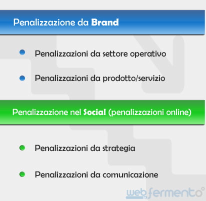Volendo distinguere le tipologie in macrocategorie, potremmo parlare di penalizzazioni da brand e penalizzazioni da gestione della comunicazione. Le prime riguardano quei casi in cui, l’azienda è impossibilitata ad essere “social” perché negli anni si è costruita una reputazione negativa verso i propri clienti. La seconda tipologia riguarda invece quelle aziende che sono idonee ad una presenza sui social media, ma incorrono successivamente in errori legati alla strategia o alla gestione della comunicazione e conversazione con la propria audience.