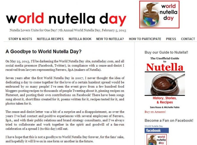 Bisognerà capire cosa frulla nella testa dei dirigenti di Nutella (secondo me qualche rotella è saltata) perché chiudere un’intera community autogenerata ed autoalimentata è veramente “una cagata pazzesca” per dirla alla Fantozzi. E’ di oggi l’annuncio che Ferrero ha deciso di far chiudere il World Nutella Day, l’evento dei fan che celebra lo storico e goloso prodotto che aveva raccolto 40 mila fans su facebook e 7 mila followers su Twitter. Verrà chiusa la pagina Facebook, il canale Twitter e lo stesso sito che ospitava oltre 700 ricette a base di Nutella inviate dai fans.