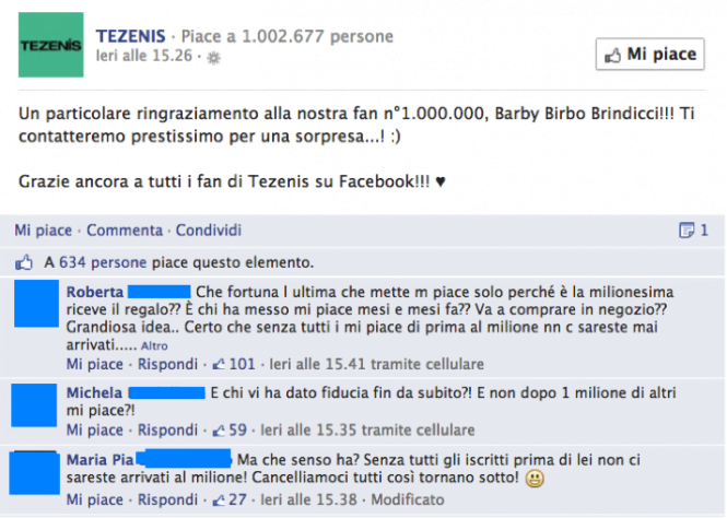 In effetti anche io alcune delle campagne, come quella della Tezenis, non la giudico del tutto sbagliata, ci può anche stare voler premiare il 1.000.000 fan, l’ha fatto anche Apple più volte (mi sembra con app e brani di iTunes) ed un simile putiferio non si è mai generato che ben ricordi.