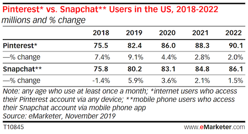 La cosa interessante è che le proiezioni per i prossimi anni riportano Pinterest in crescita costante, e nel 2022 il canale affermerà la sua superiorità rispetto a Snapchat.
