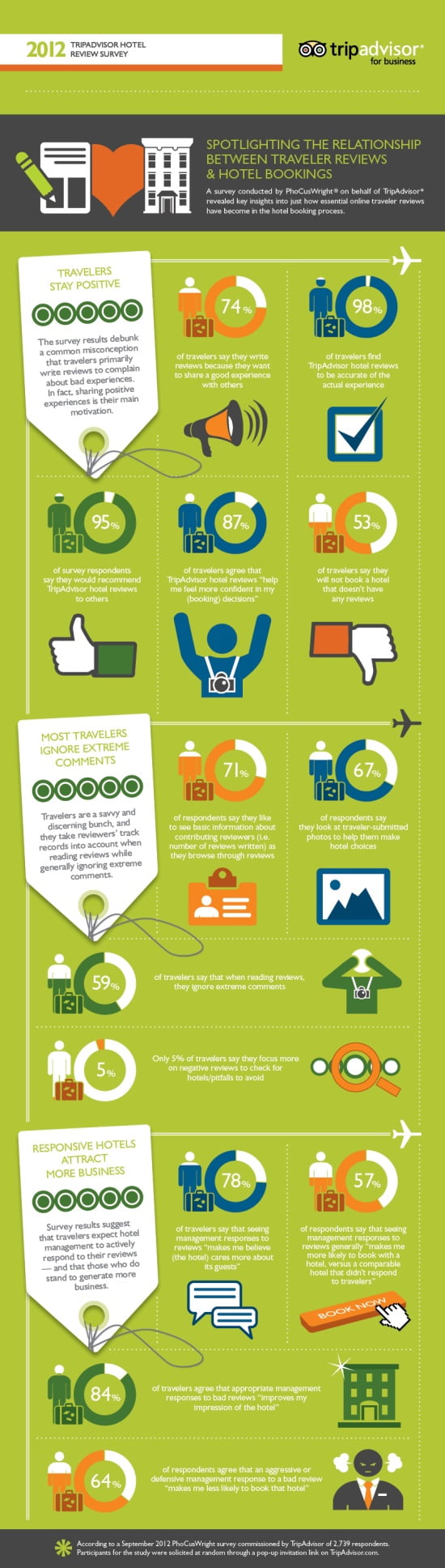 - Per le recensioni negative, l’84% degli utenti concordano sul fatto che una risposta appianatrice migliora l’impressione generale dell’hotel. In più il 64% degli utenti concordano sul fatto che una risposta aggressiva o difensiva del gestore, nei confronti di un commento negativo, rende gli utenti meno propensi a prenotare.