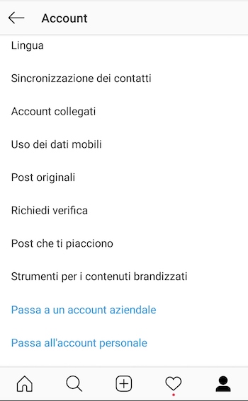 - vai alla sezione Account e seleziona la voce Passa a un account aziendale;