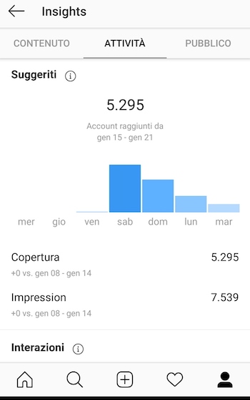 Il profilo Instagram aziendale si differenza dal profilo privato soprattutto perché ti consente di accedere alle statistiche. Dopo la creazione del profilo, dal momento in cui pubblicherai la prima foto e/o storia, dovrai aspettare almeno un giorno prima di poter visualizzare i primi dati statistici significativi, come la reach (copertura), le impression (visualizzazioni), invio di e-mail e click sul sito web.