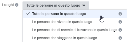 Le persone che di recente si trovano in questo luogo: include le persone la cui posizione più recente tramite smartphone risulta essere in questo luogo, quindi raggiungeremo sia chi ci vive stabilmente, sia chi vi si trova perché in viaggio. Ovviamente saranno esclusi coloro che ci vivono, ma la cui posizione più recente è fuori da questa area.