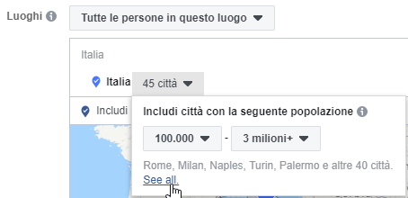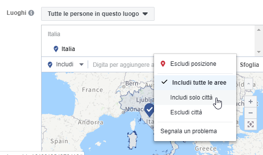 Cliccando sulla freccetta a lato, abbiamo la possibilità di selezionare se vogliamo includere tutte le aree (e qui lasciamo fare a Facebook!) oppure se includere solo le città o escludere proprio queste ultime.