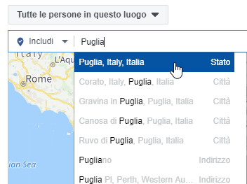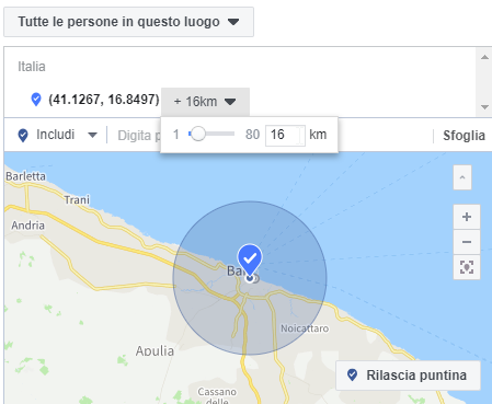 Possiamo scegliere come target lo Stato, una regione, o anche la città, con la possibilità di impostare un raggio chilometrico intorno ad essa. Inoltre è possibile inserire direttamente un CAP e un indirizzo fisico.